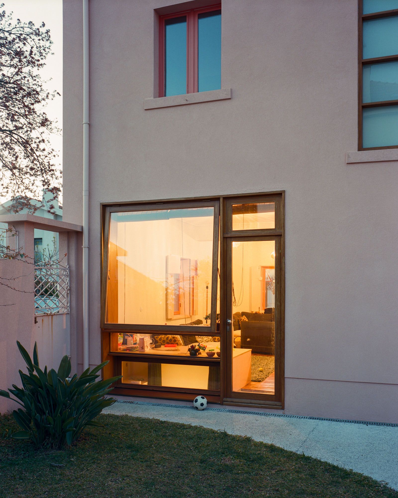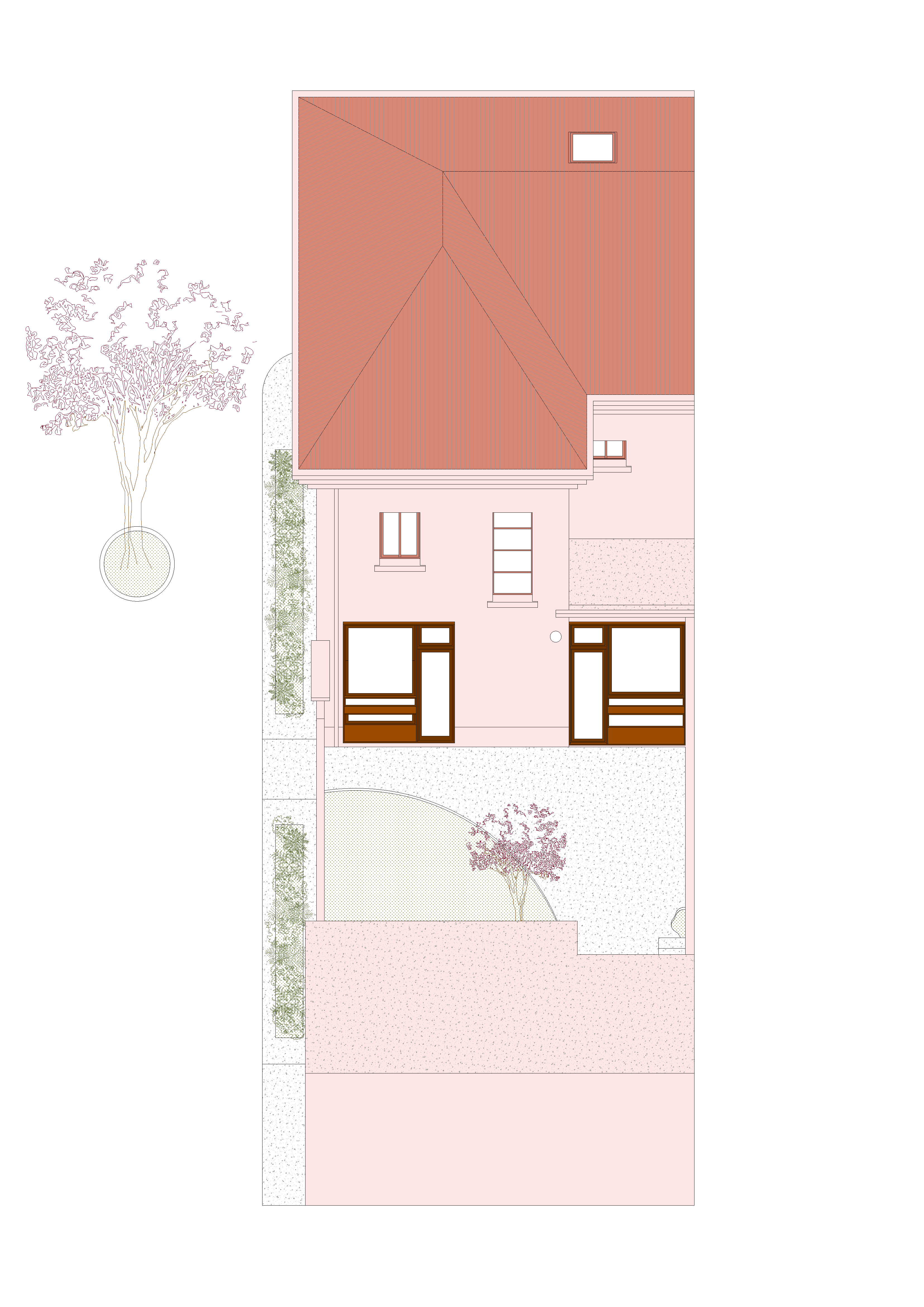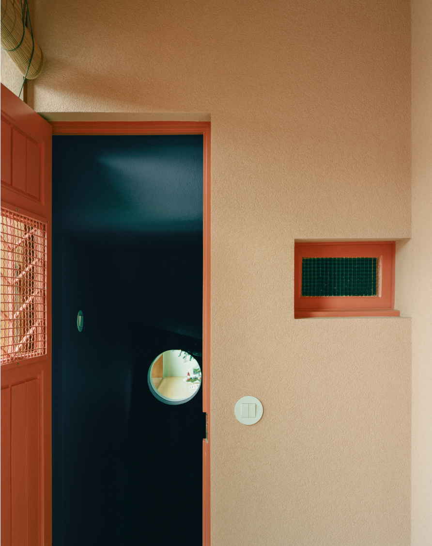 With the aim of keeping the house in tune with the forms of contemporary living, the economy of gestures in the existing building was extended into an experiment with new openings and colors. Inside, the demolition of a wall and occasional new openings between existing rooms reorganized the visual relations of the interior, in a kind of modest raumplan. In respect to the rear façade, its composition was complexified with two new (apparently) symmetrical windows. On the right, a porch was transformed into a new winter garden. On the left, the window unfolds into a bench, which in turn acts as a skylight to illuminate and ventilate a basement turned into workspace for a film-maker. In contradiction to the existing openings (both in shape and color), these two new lenses pointed at the garden proved to be important climate control devices, particularly during the winter. As for the colors, like everything else, they were carefully chosen so that changing almost nothing, everything could be different. Ultimately, the project aims to restore the house to an original state that has never existed as such.