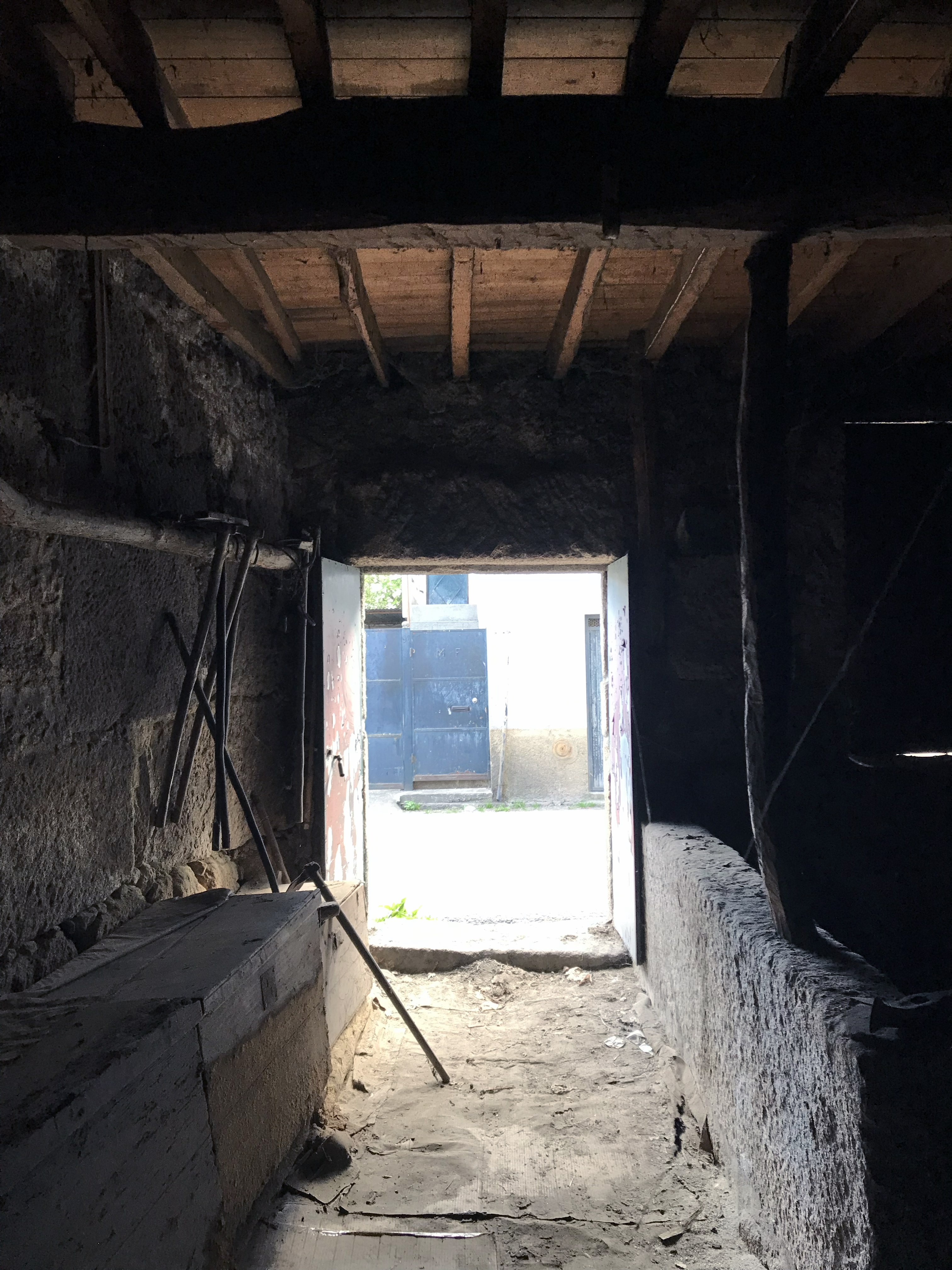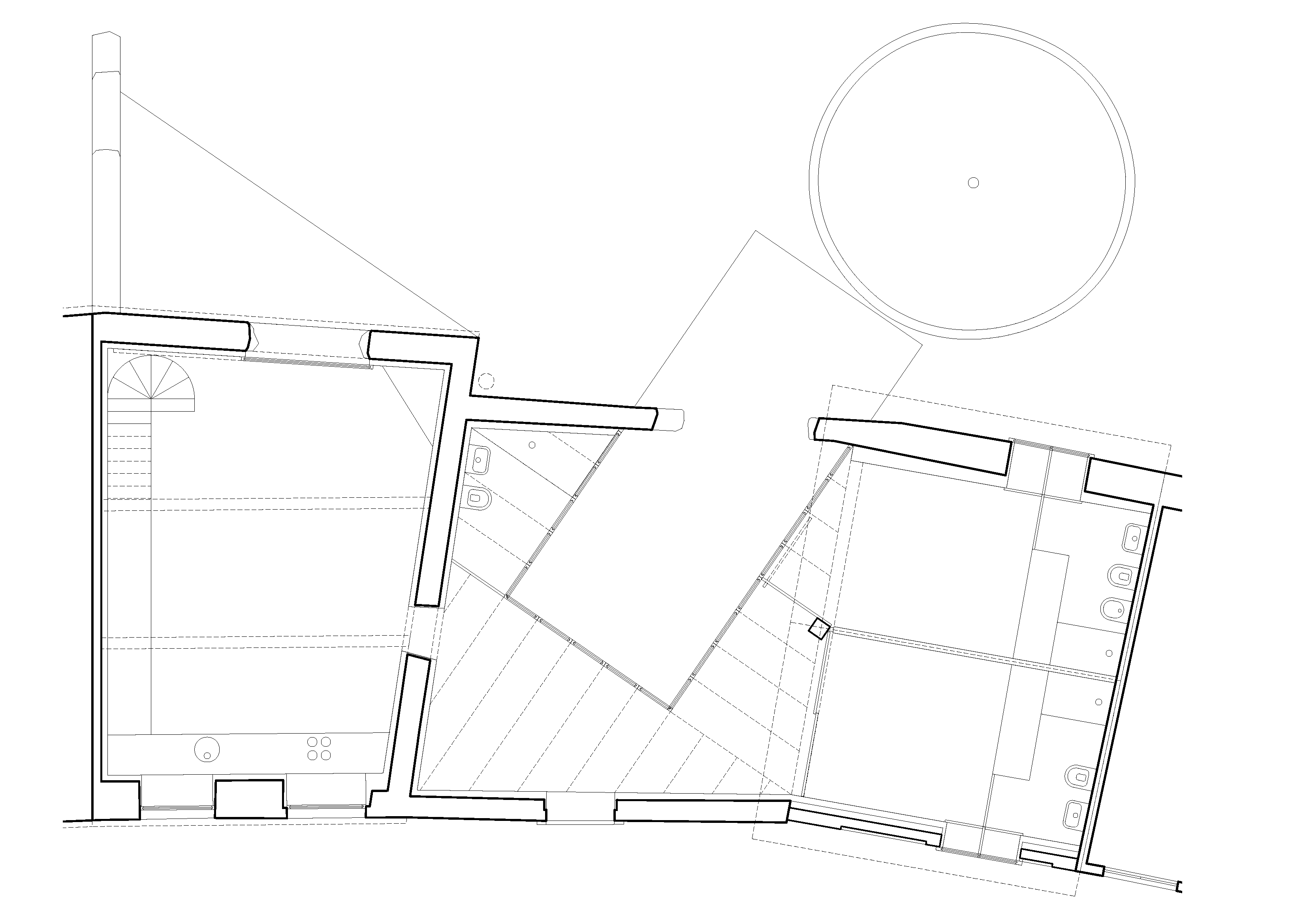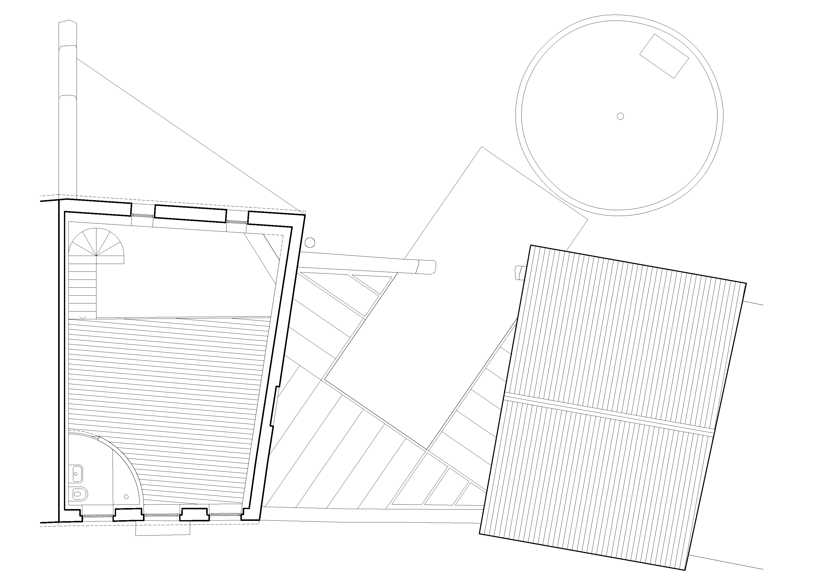 Inside the main house, a cut-out in the existing wooden structure transforms the second floor into a mezzanine that extends the social space of the house around a double-height ceiling. The bedrooms occupy the ruin of the old annex building, which will be completed with a new wooden roof structure. Its walls will be filled in and reinforced with a new concrete wall, on which the old fenestration will be printed in bas-relief. Two new windows provide light and ventilation to the room, reinterpreting the design of the old sash windows.