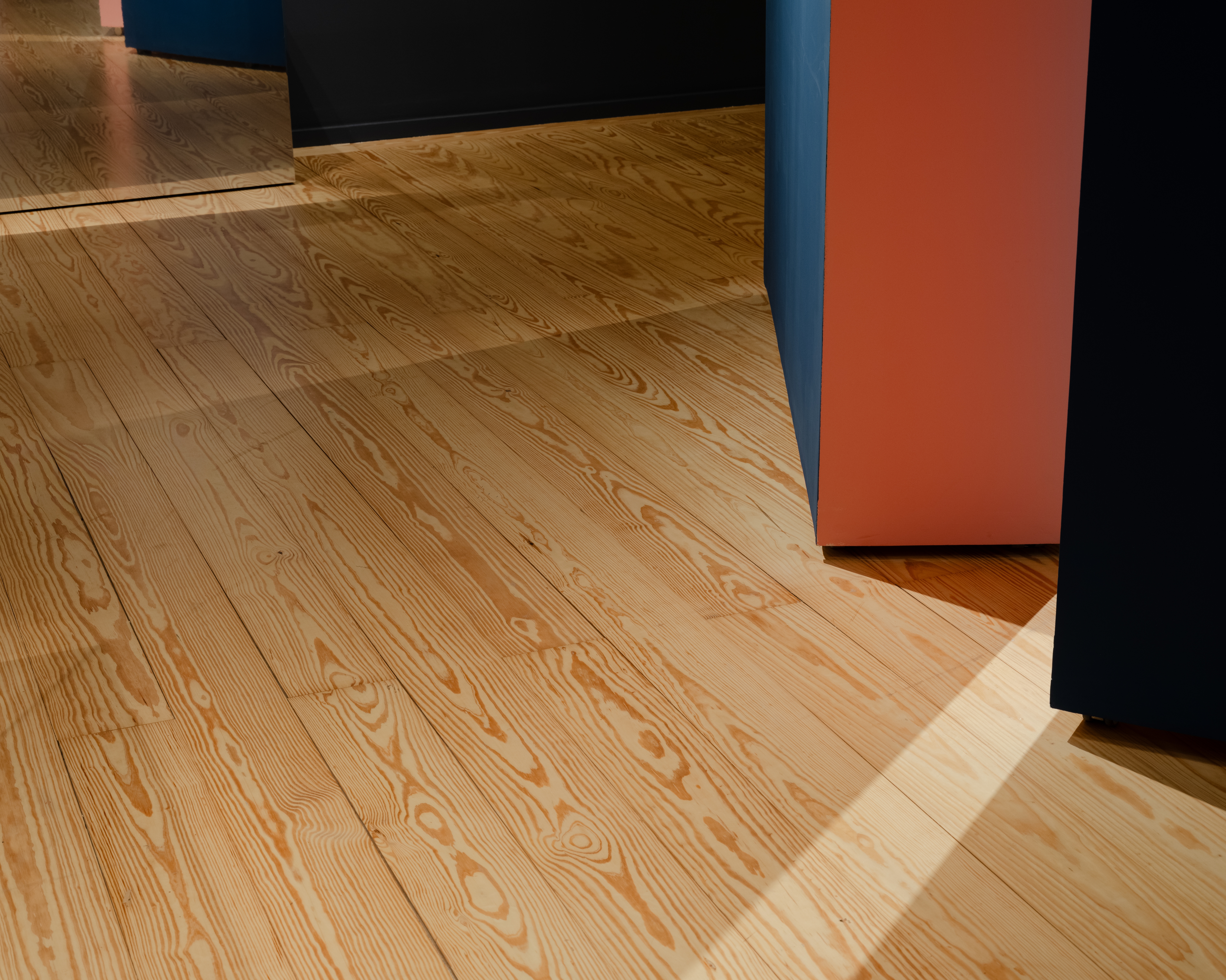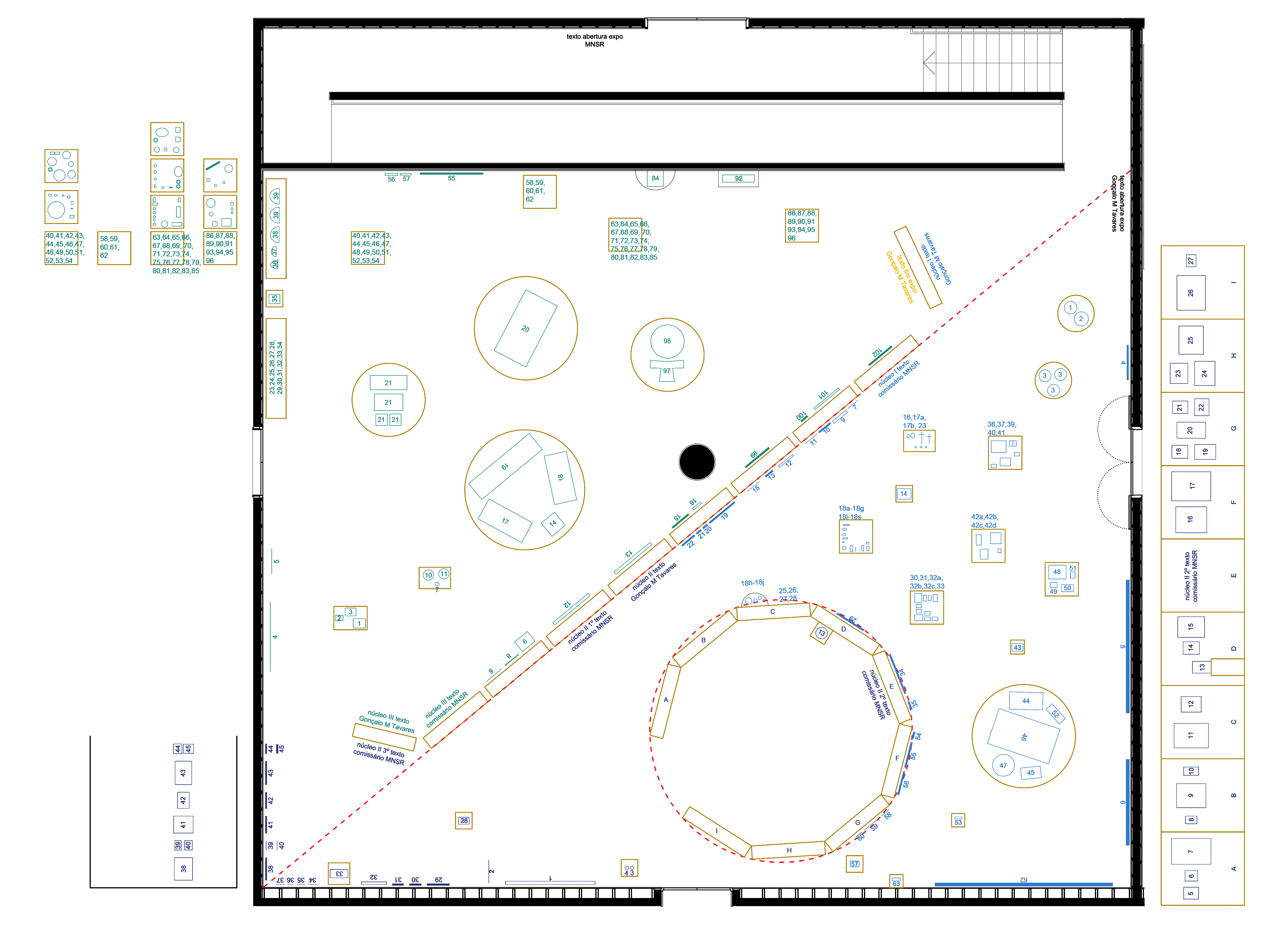 A exposição foi organizada a partir destes elementos, que definiam três zonas distintas no espaço. Para tornar essa distinção mais clara, atribuiu-se uma cor a cada zona. A primeira camada da planta resultou da organização das paredes móveis, dispostas de modo a formar uma diagonal – que dividia a sala em dois setores –, e um decágono, estabelecendo assim a base formal do percurso expositivo. As cores escolhidas para a cenografia tiveram como ponto de partida uma tapeçaria que se encontrava exposta na sala de exposições temporárias na nossa primeira visita, onde identificámos as cores que gostaríamos de utilizar.