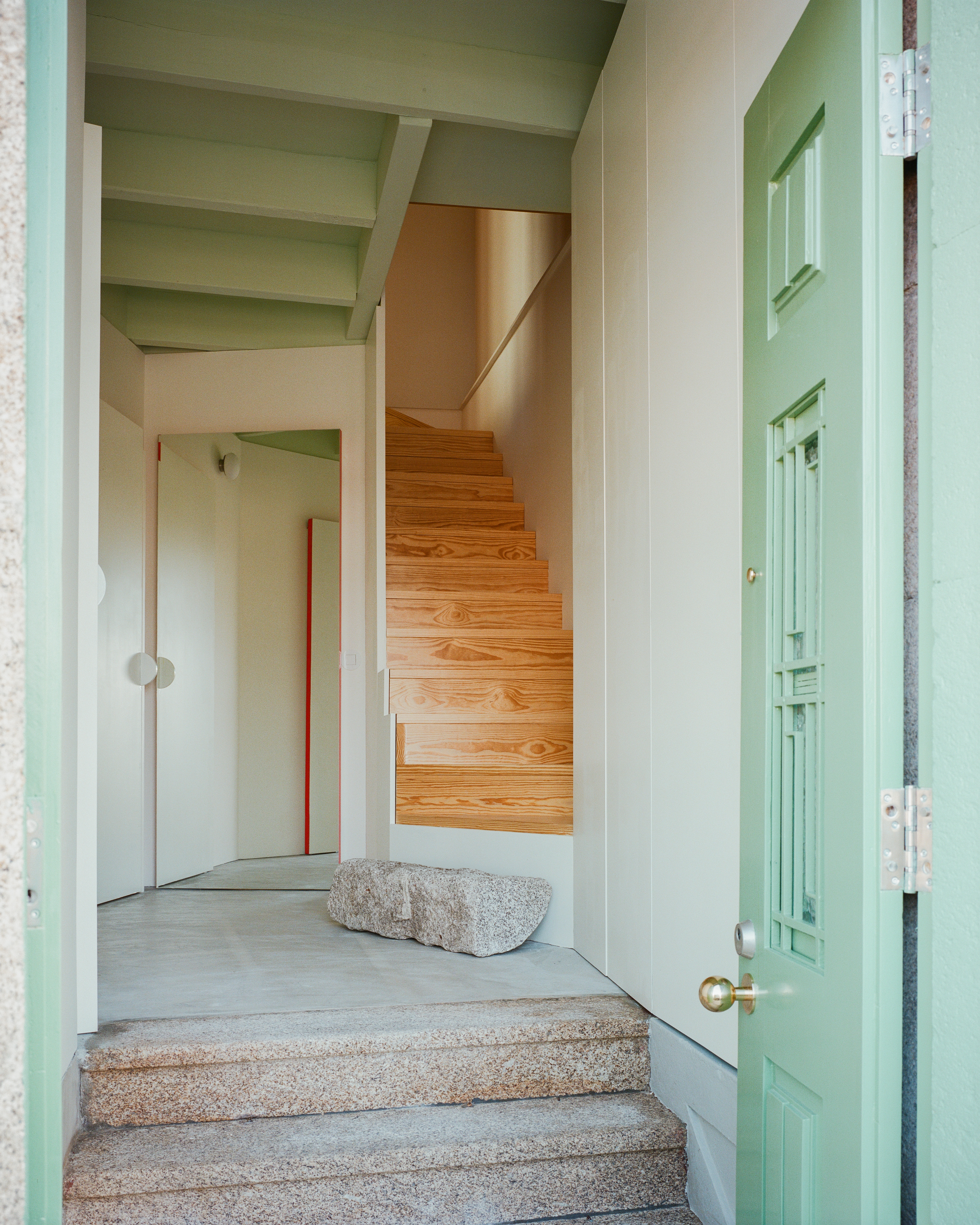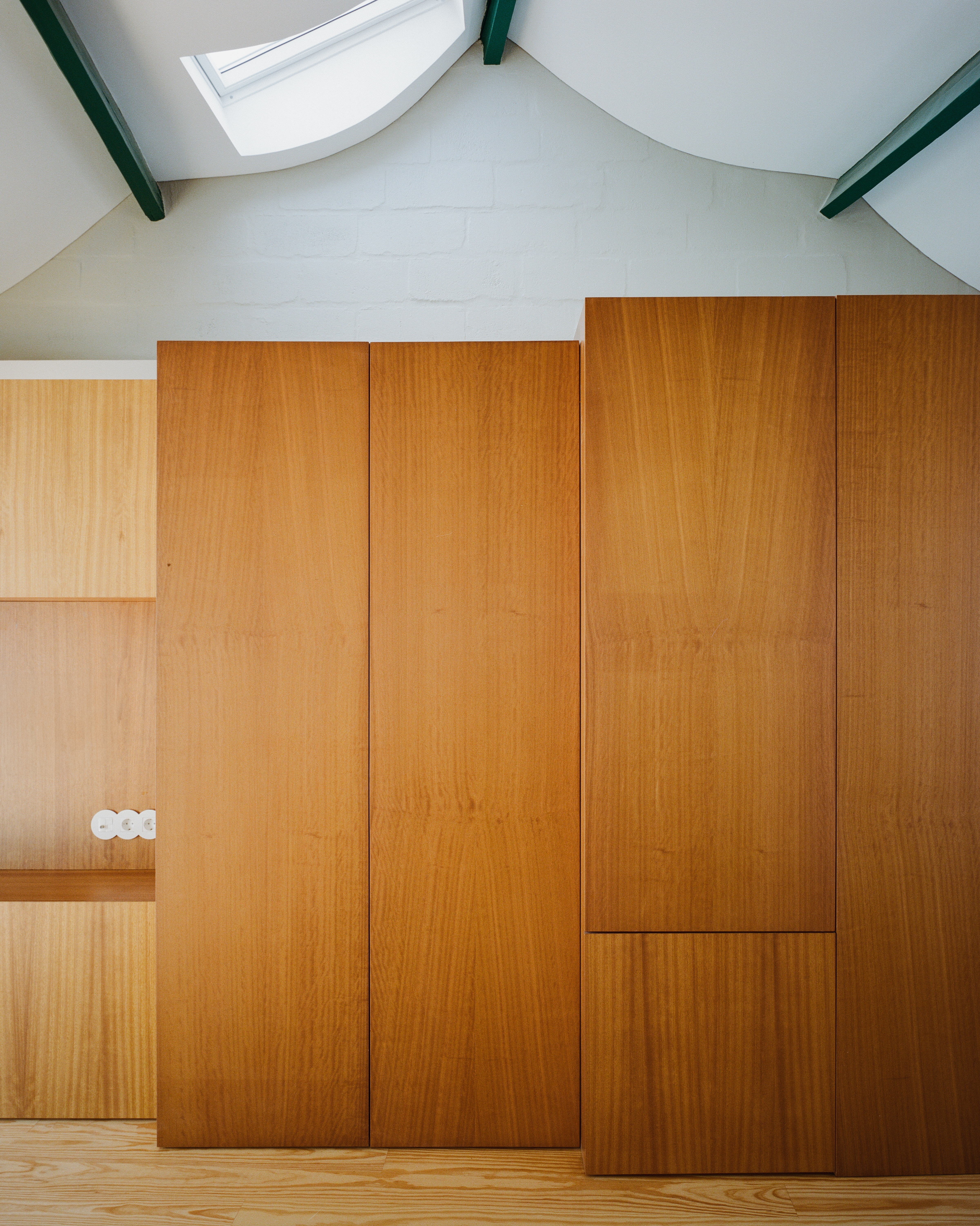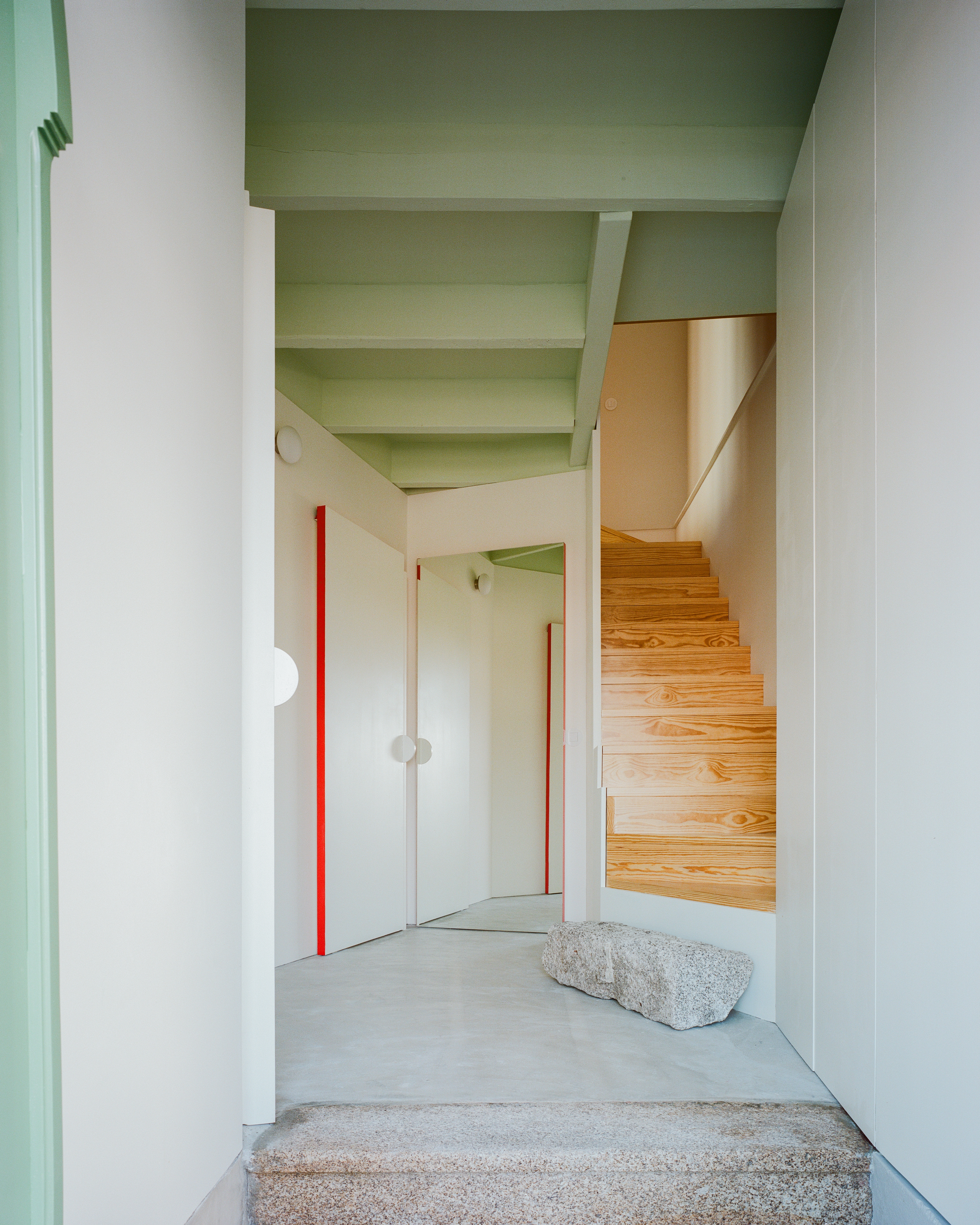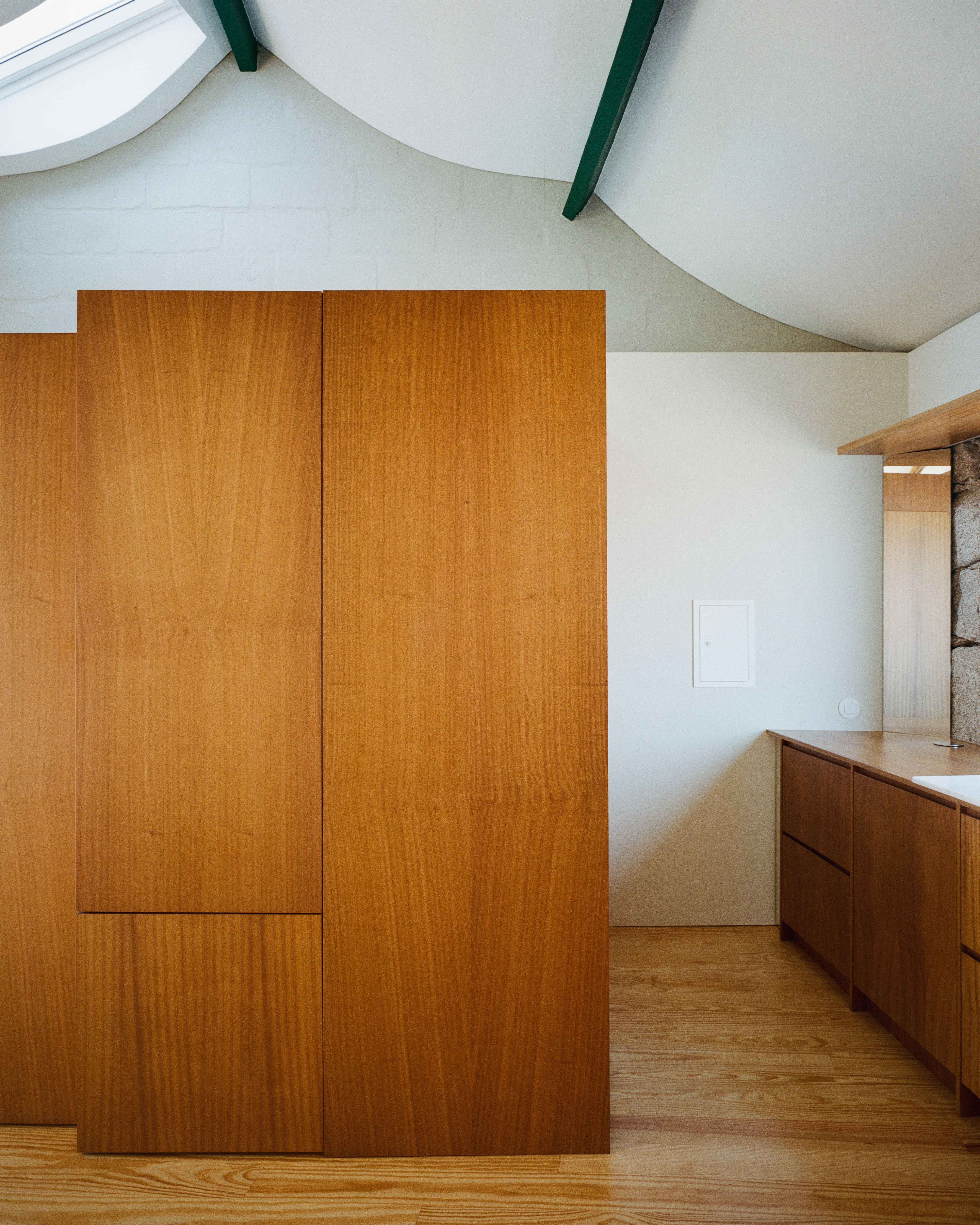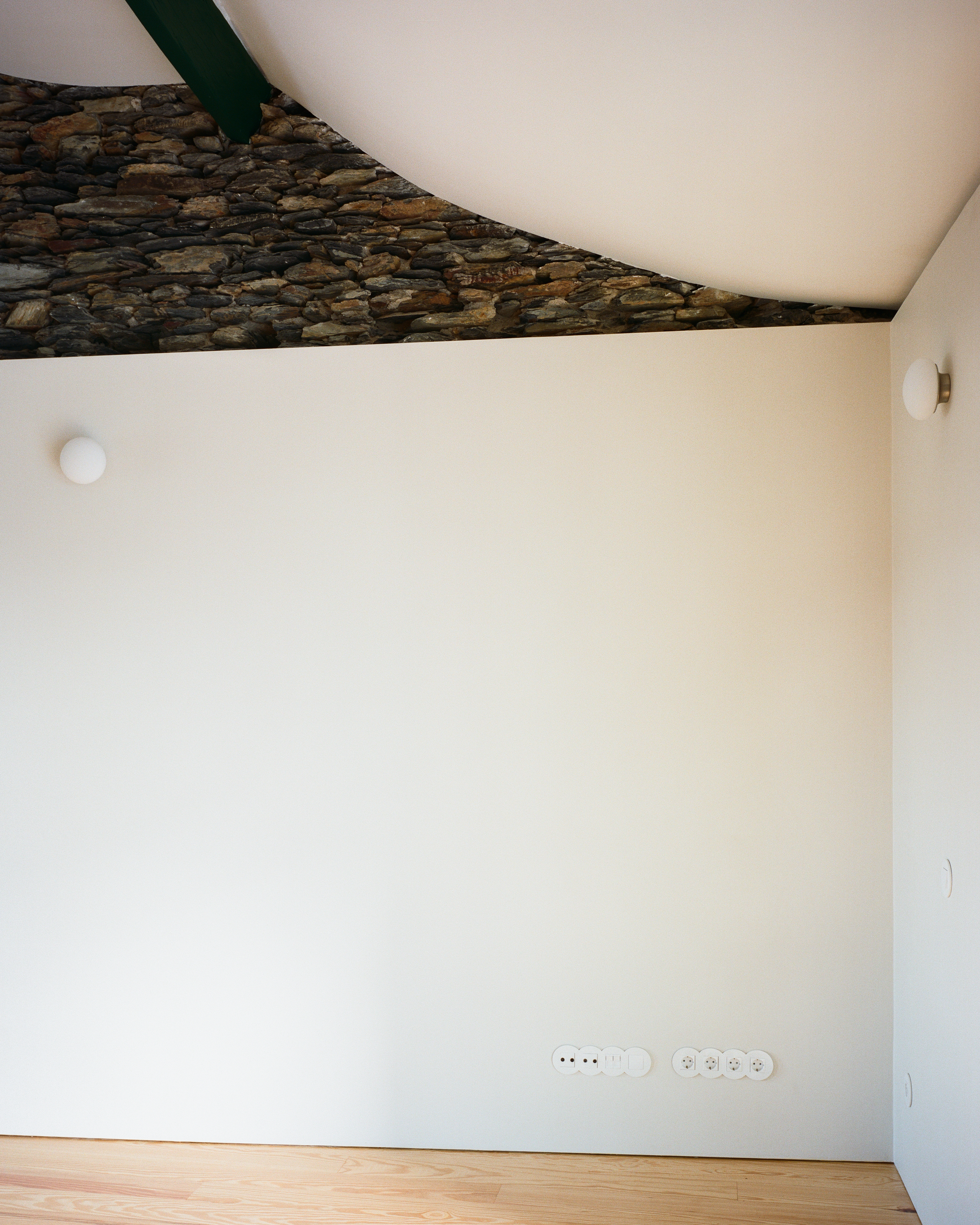 Esta é uma casa pequena, que se sente maior do que é e não deixa de conter tudo o que é necessário para a vida doméstica dos seus habitantes. No fundo, é uma casa como todas deveriam ser. Num excurso tipológico acabámos por desenhar uma casa reconstruída tal ‘como achada’, mas virada ao contrário. Os quartos ficam em baixo, entre a rua e um pátio, com diferentes graus de privacidade. A geometria excêntrica do vestíbulo de entrada confere-lhe acessibilidade e uma generosidade inusitada para uma casa desta dimensão. A sala principal ocupa todo o piso sob a cobertura. Fica com as melhores vistas, com a ventilação cruzada e um pé-direito mais generoso, celebrado pelas catenárias em gesso cartonado projectadas em obra: pelo acaso e pelas mãos dos operários.