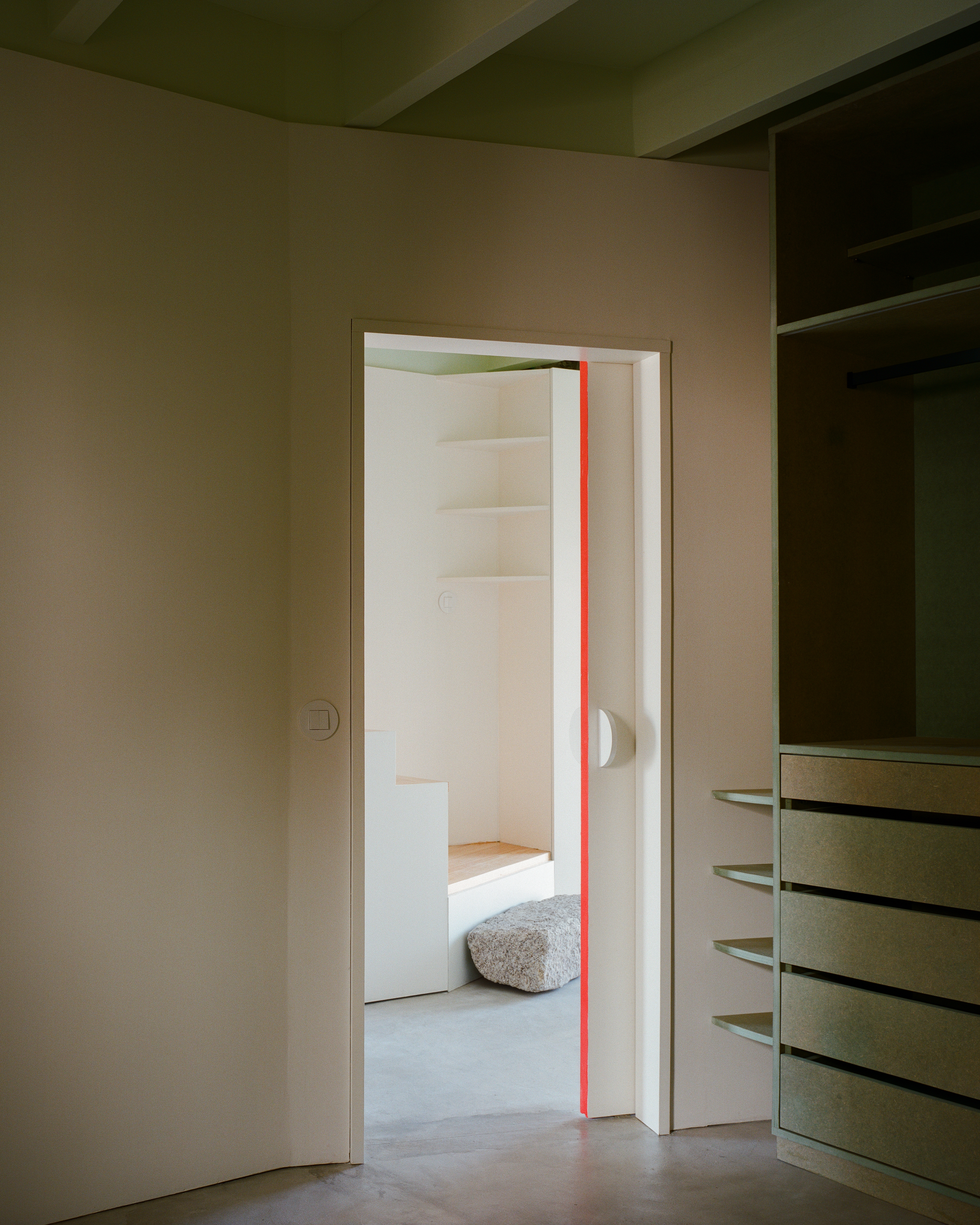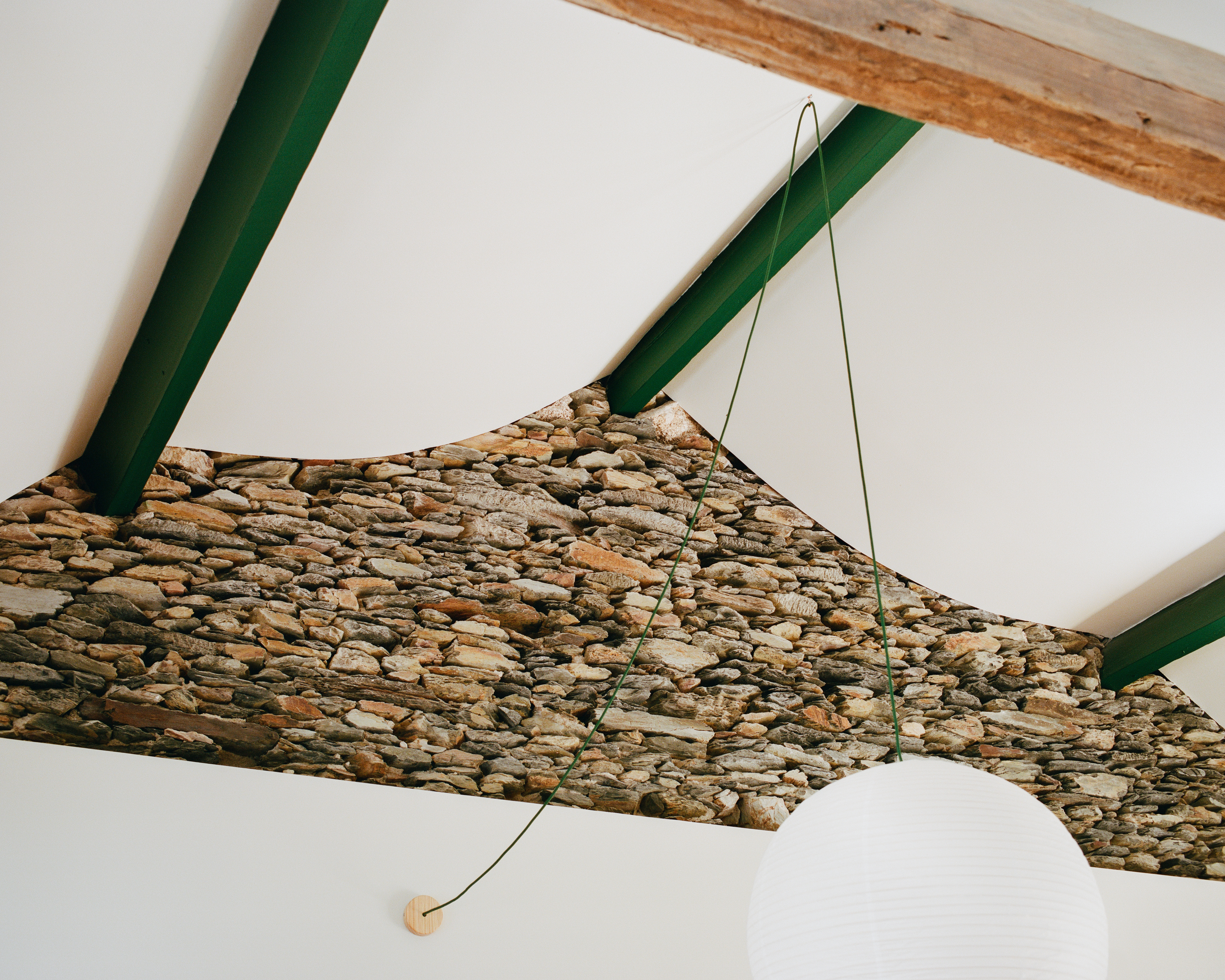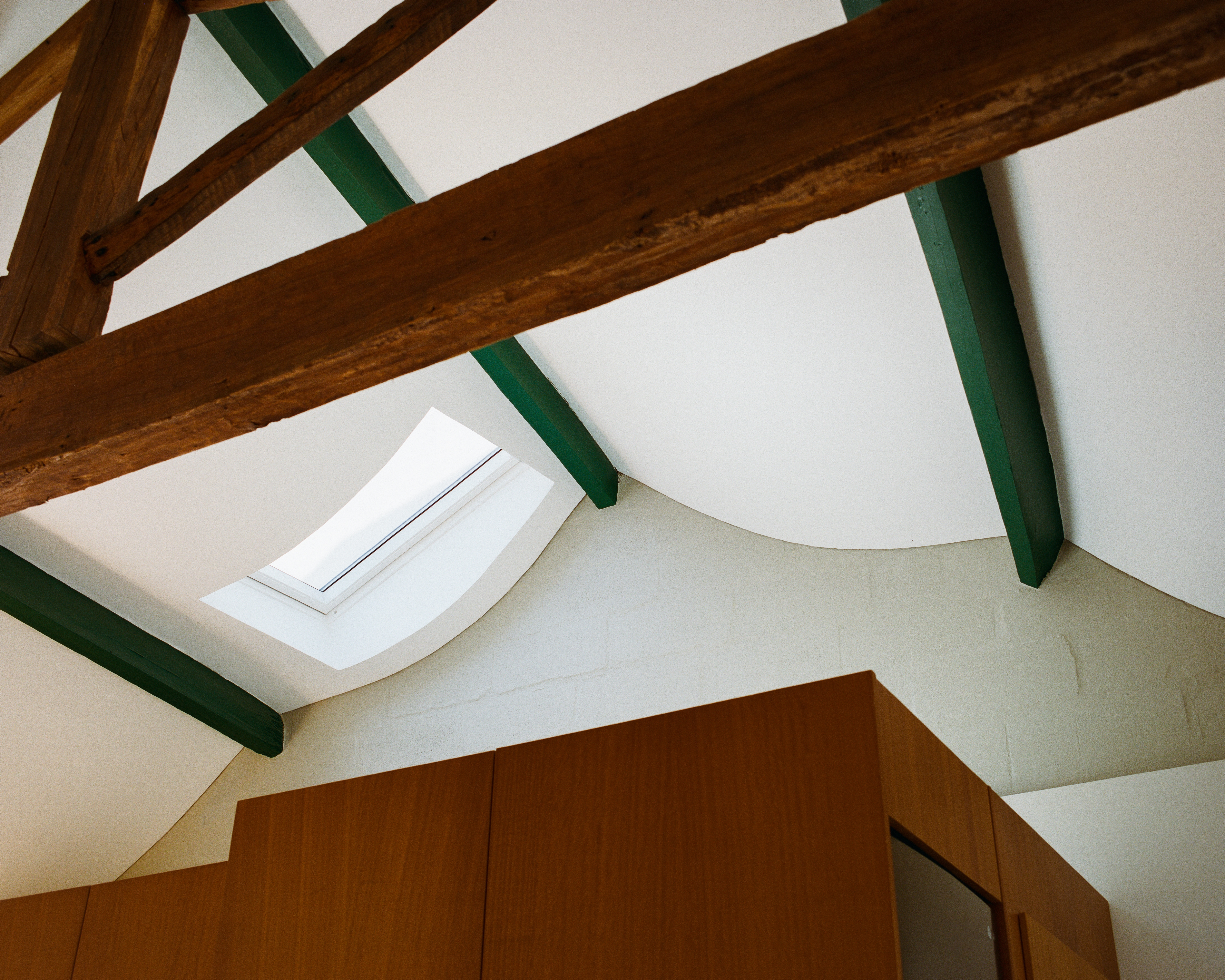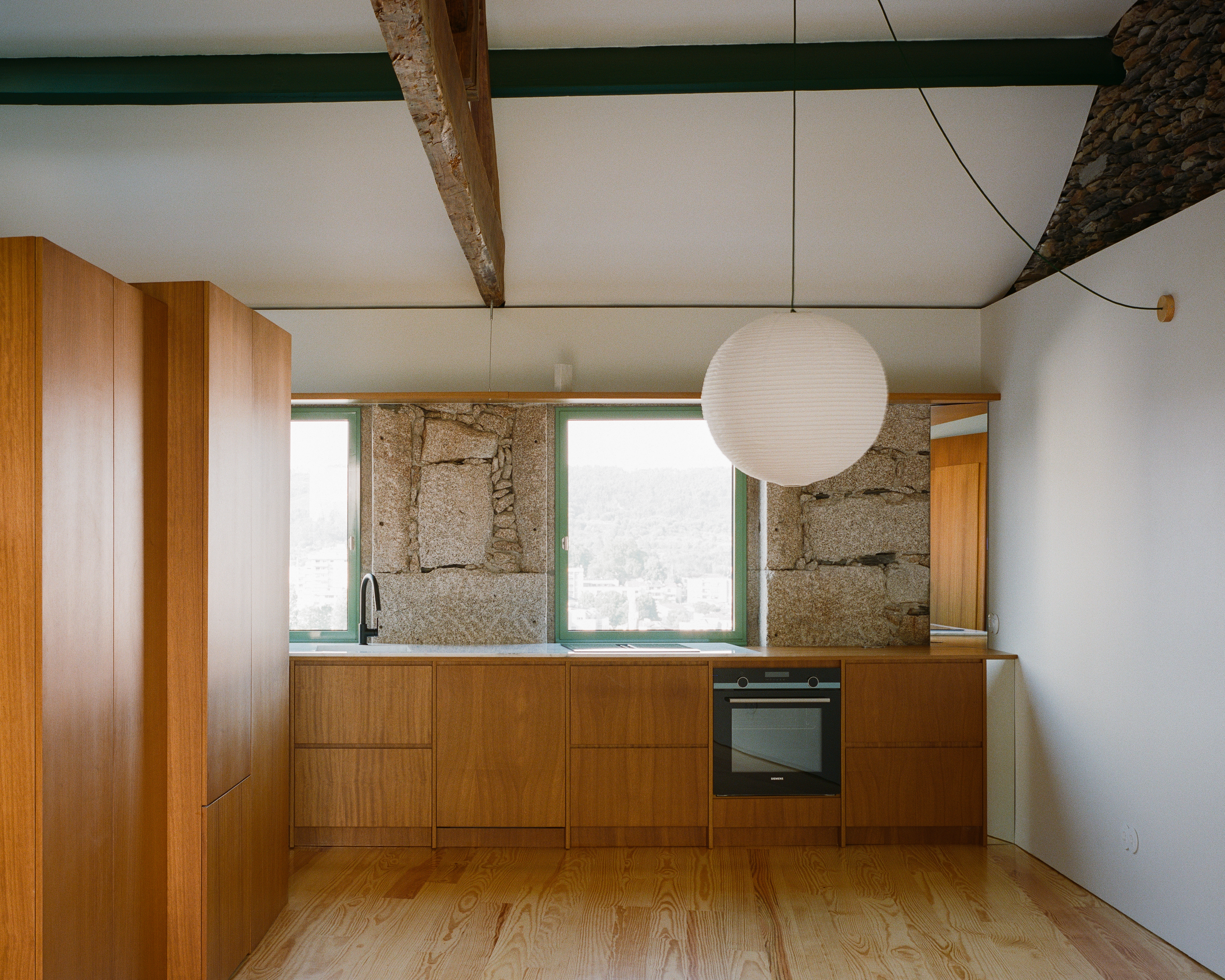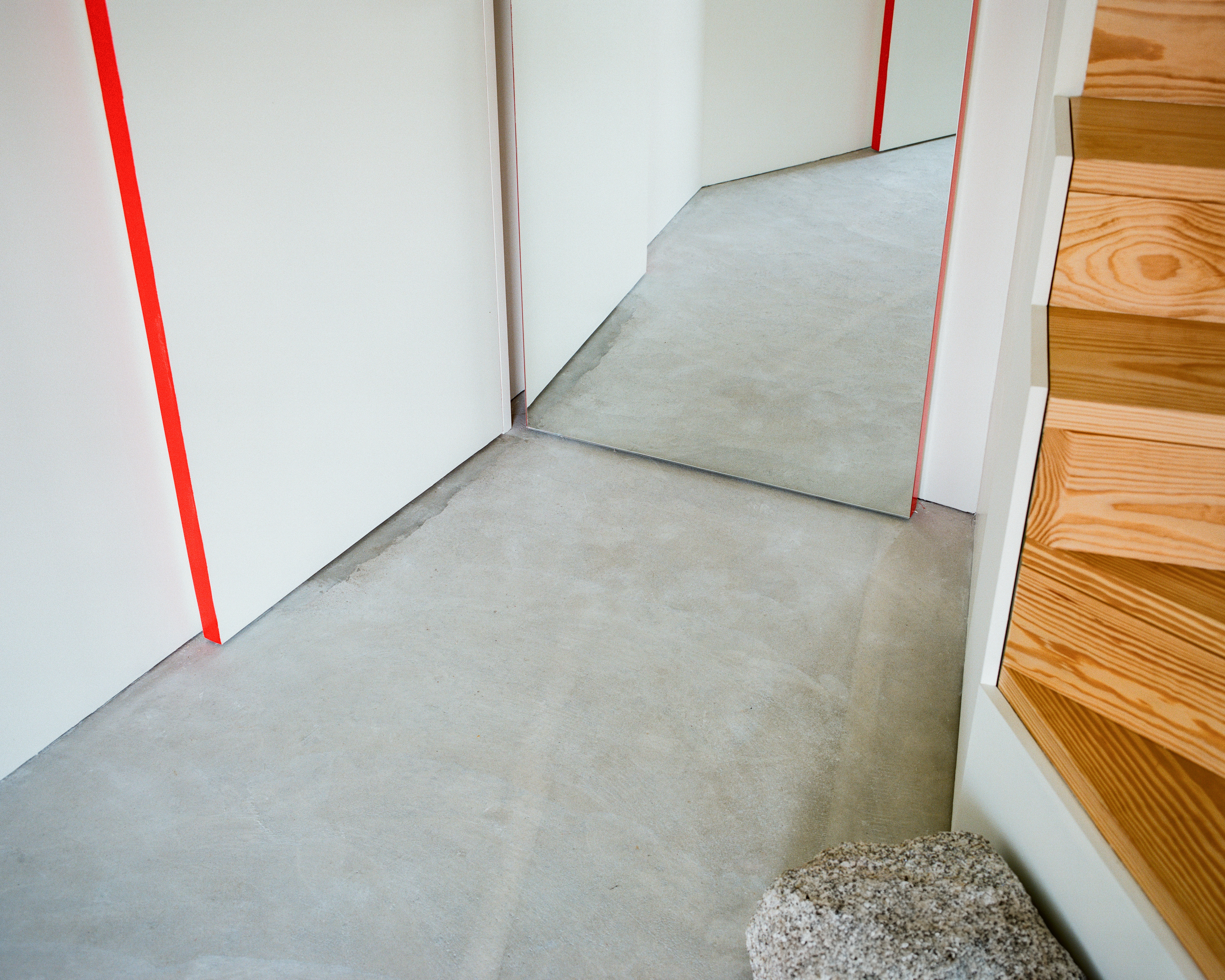 Esta é uma casa pequena, que se sente maior do que é e não deixa de conter tudo o que é necessário para a vida doméstica dos seus habitantes. No fundo, é uma casa como todas deveriam ser. Num excurso tipológico acabámos por desenhar uma casa reconstruída tal ‘como achada’, mas virada ao contrário. Os quartos ficam em baixo, entre a rua e um pátio, com diferentes graus de privacidade. A geometria excêntrica do vestíbulo de entrada confere-lhe acessibilidade e uma generosidade inusitada para uma casa desta dimensão. A sala principal ocupa todo o piso sob a cobertura. Fica com as melhores vistas, com a ventilação cruzada e um pé-direito mais generoso, celebrado pelas catenárias em gesso cartonado projectadas em obra: pelo acaso e pelas mãos dos operários.