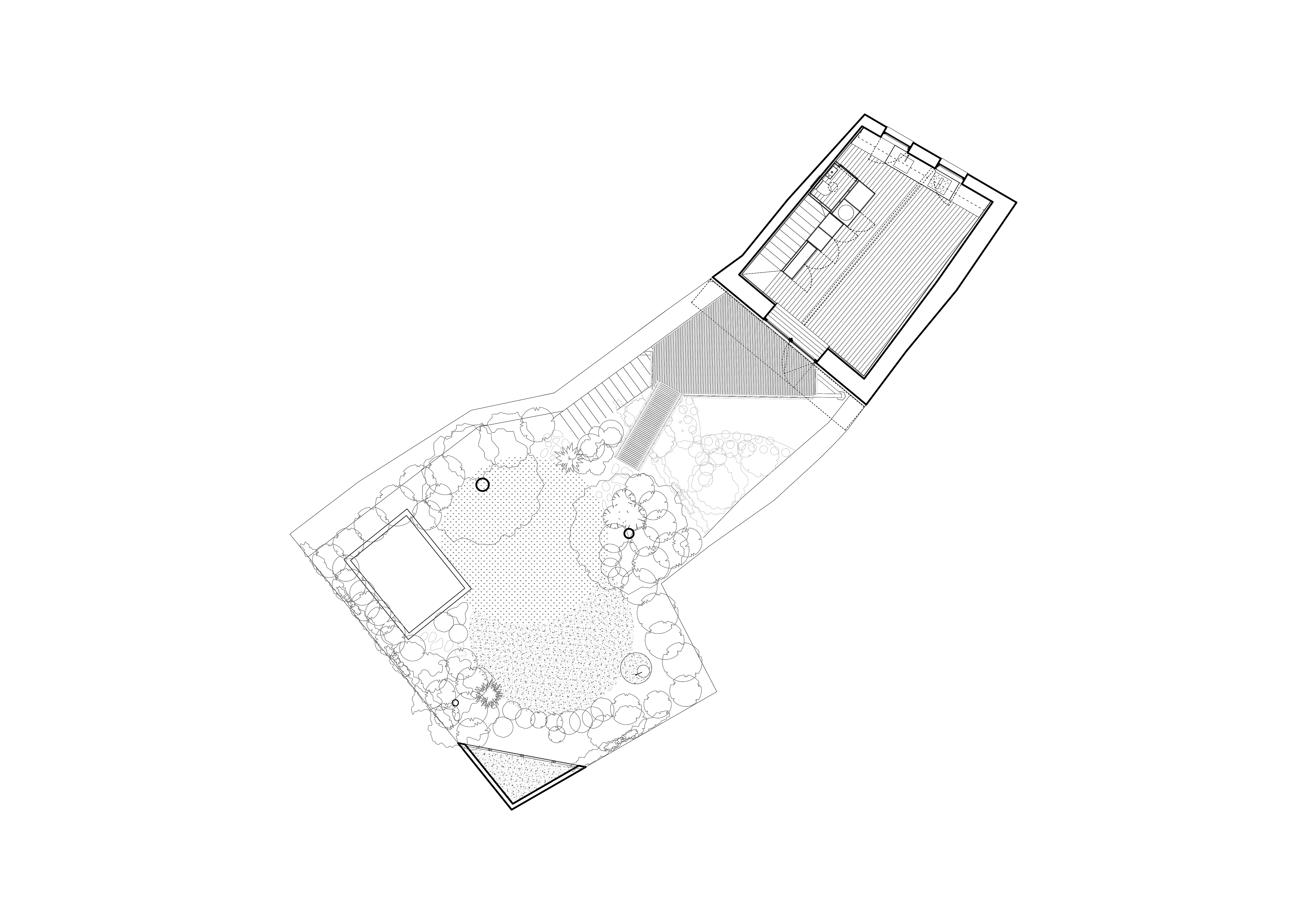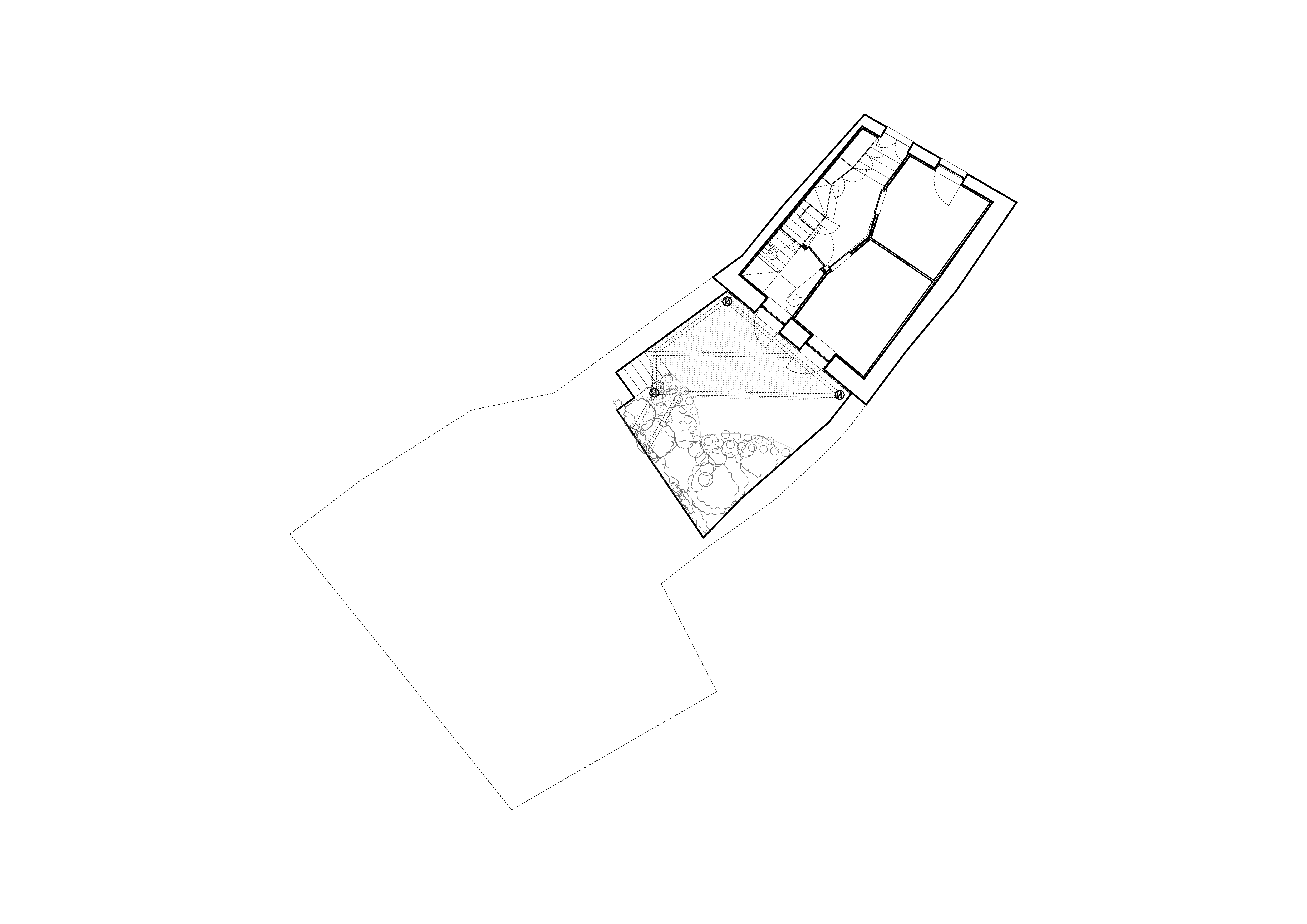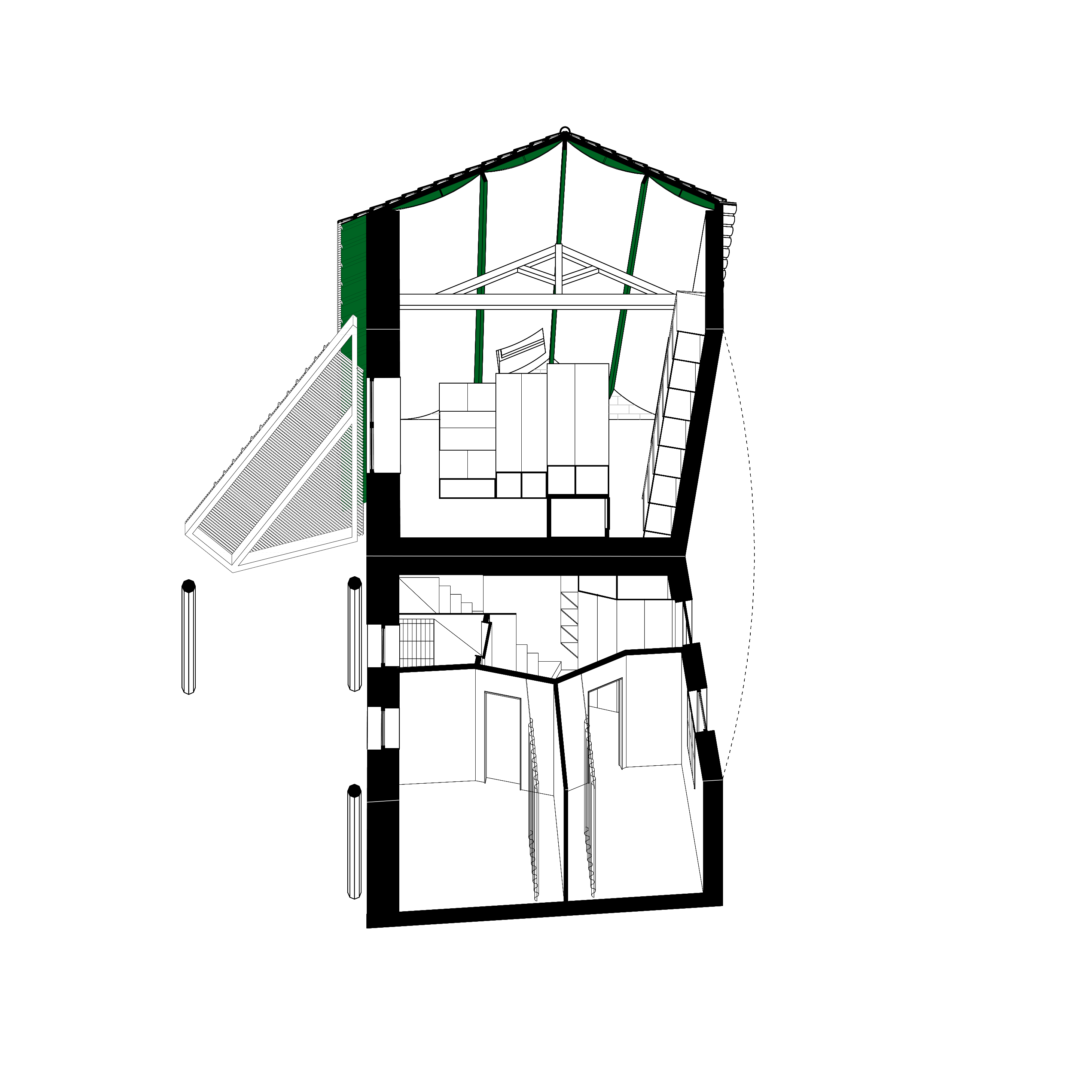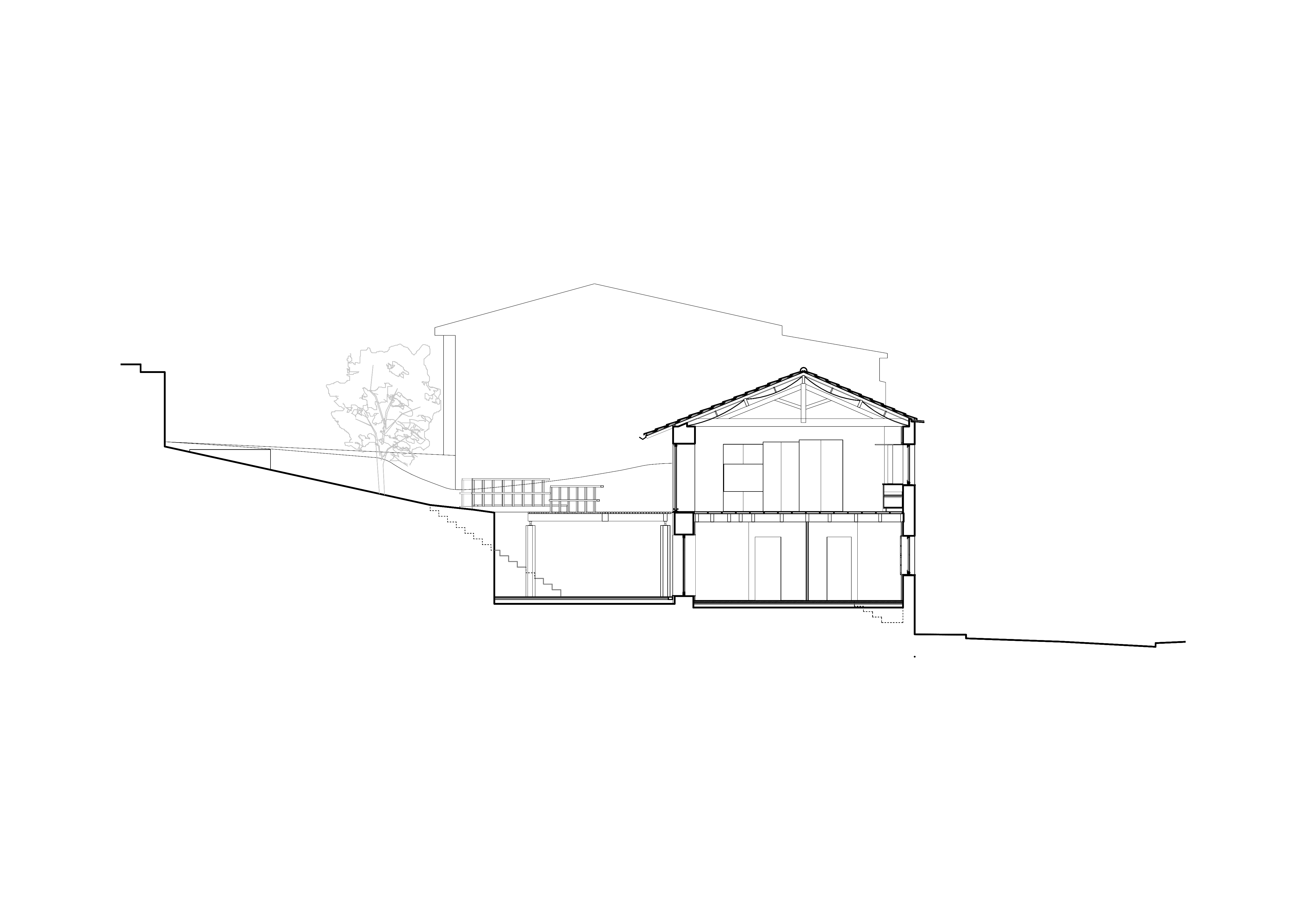 Uma escada, a tardoz e paralela à parede de meação, era o único elemento que sobrava na casa antes da nossa intervenção. Para além desta, pouco mais do que umas paredes em pedra e uma estrutura de madeira -piso e telhado- em relativo bom estado. A escada era precária, mas a sua posição estranha serviu de pretexto. Por ser precária, foi substituida. Os restantes elementos foram mantidos e valorizados pelo novo desenho da casa. As madeiras existentes foram pintadas, para permitir a substituição pontual de peças e garantir uma leitura de continuidade entre espaços. Pouco foi acrescentado. No piso de baixo umas paredes novas de tabique separam quartos de dimensão aproximada. No piso de cima, um núcleo infraestrutural arruma a aparato técnica da casa. A asna existente repousa agora numa nova viga massiva de madeira que permitiu abrir uma nova janela sobre o jardim, à cota alta. Um terraço ligeiro, em madeira, garante que ficam ligados.