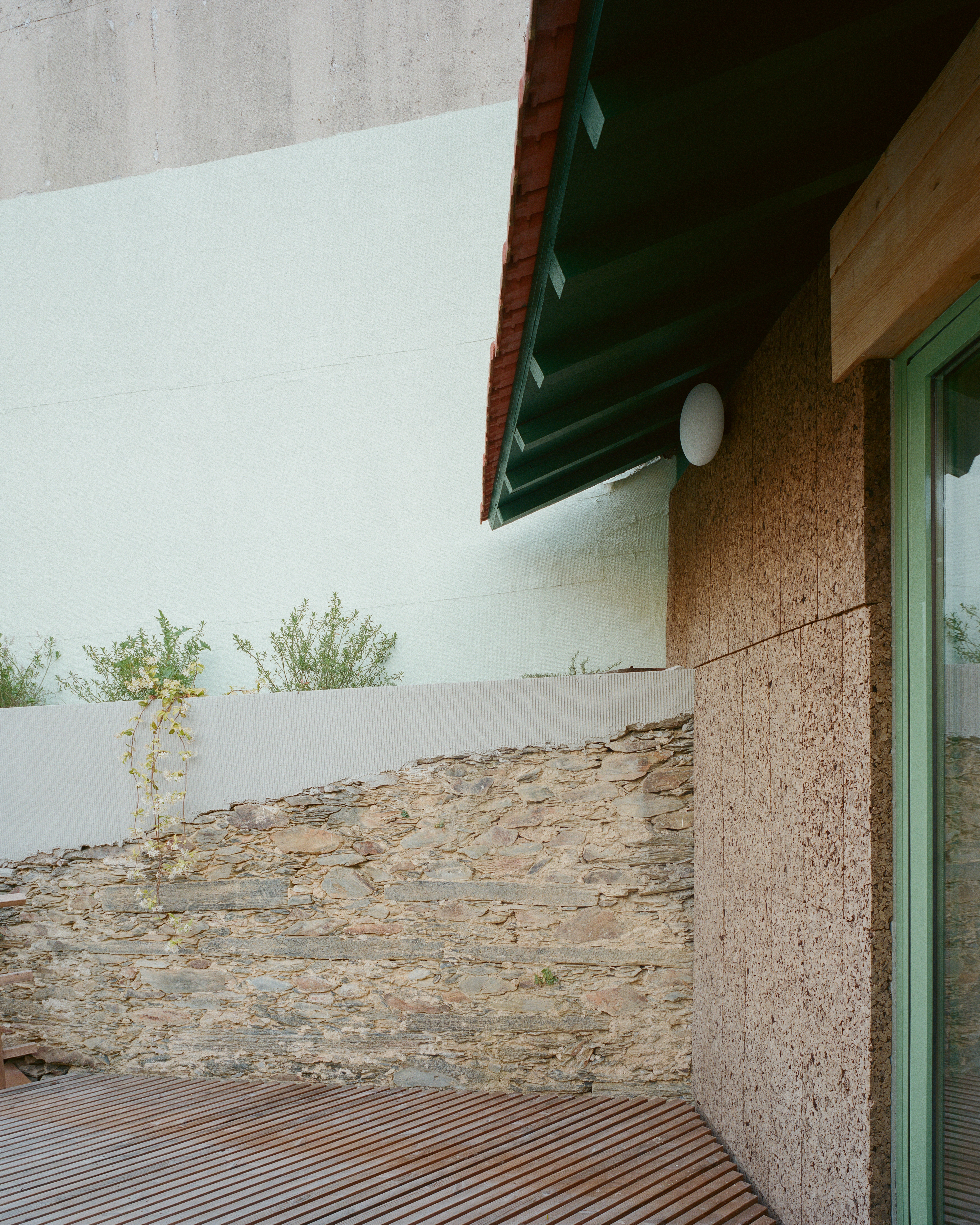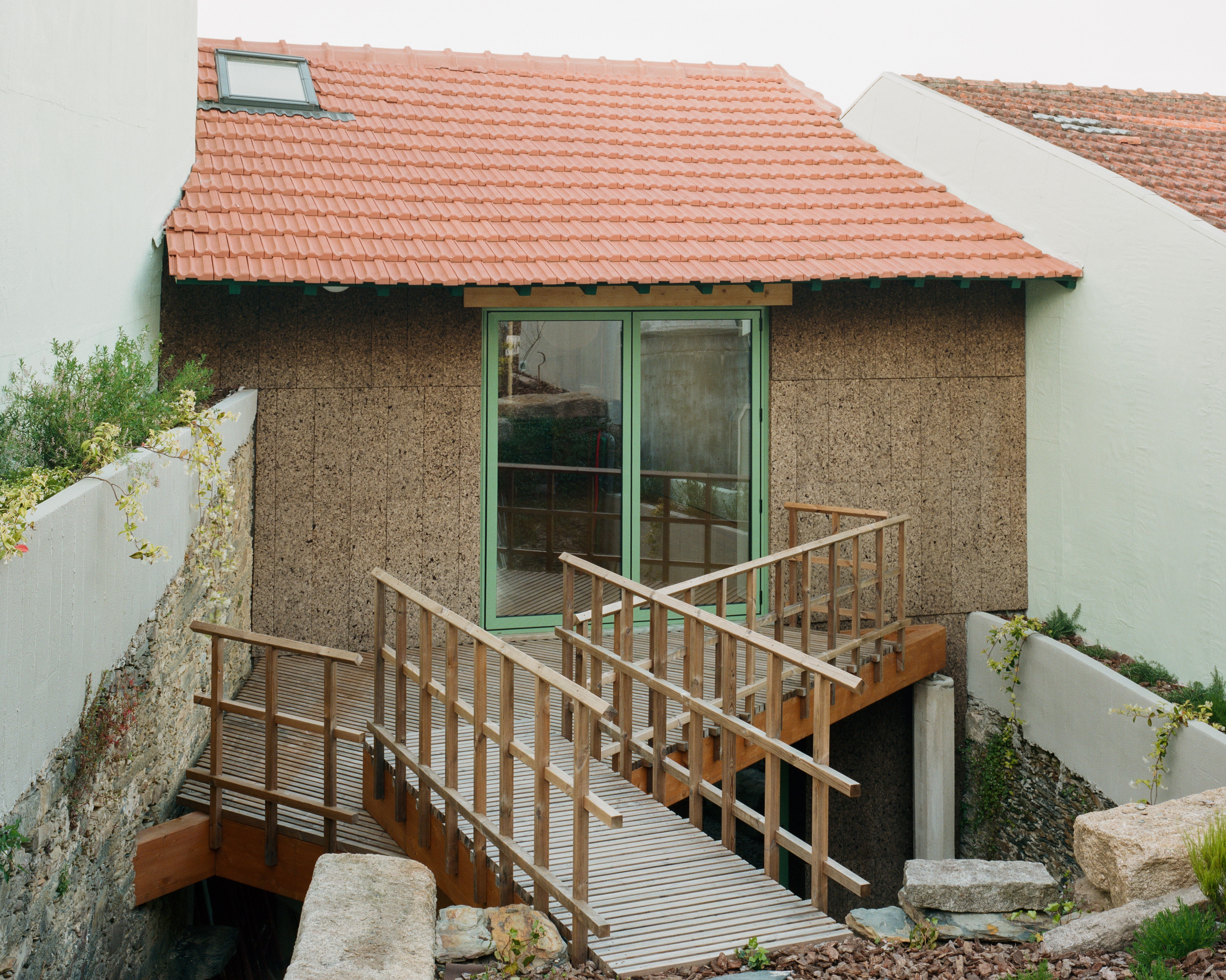 O projecto de execução foi mínimo. A disposição espacial manteve-se, mas o processo de construção, lento e realizado em contacto directo com os operários, permitiu improvisar uma série de experiências não previstas em fase de projecto. No exterior, encontramos uma fachada em cortiça aparente, três colunas de betão octogonais feitas com recurso a cofragens recicladas, um tanque em betão e uma parede espelhada que reflecte o jardim projectado com o atelier pomo. Tal como o projecto, esta é uma casa pragmática e directa. Uma espécie de cabana para viver na cidade, pensada como uma casa de férias para viver o ano inteiro.